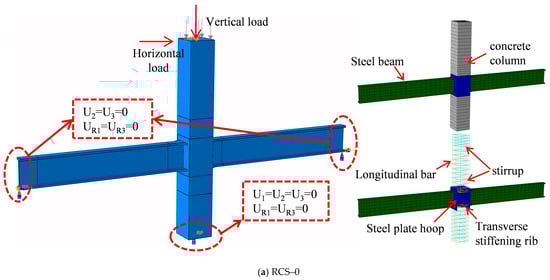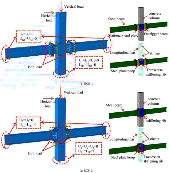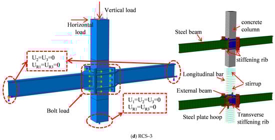 On the other hand, the basis of the development of steel–concrete combined structures is derived from traditional concrete structures and steel structures, but their stress performance has greatly improved. For concrete structures, the addition of steel can result in a reduction in the self-weight of the structure, reduce the construction cross-section area, save formwork, speed up the construction process, etc. For steel structures, the addition of concrete can increase the fire resistance and durability of the structure, improve the overall stiffness of the structure, reduce the amount of steel, and reduce the cost []. The reinforced concrete column–steel beam (RCS) combination structure has received extensive attention from scholars at home and abroad in recent years due to its ability to comprehensively utilize the advantages of steel and concrete. Compared with steel structures, RCS structures can significantly save on construction costs and increase the damping and lateral stiffness of the structure [], while the deadweight of RCS structures is lower than that of concrete structures. Numerous studies have focused on the performance of RCS structures. Le et al. [] carried out tests on concrete column–steel beam combination edge joints with built-in I-beams made of short steel. Zhang et al. [] conducted tests on steel–concrete combination beam-reinforced concrete column joints under monotonic loading. Fargier-Gabaldón et al. [] experimentally investigated the seismic performance of RCS joints and discussed the effect of column width. Men et al. [] tested three RCS subassemblies with different slab widths to study the effect of the slab on the RCS joints. However, most of these studies were based on cast-in-place RCS joints; there is a lack of studies on demountable RCS joints.