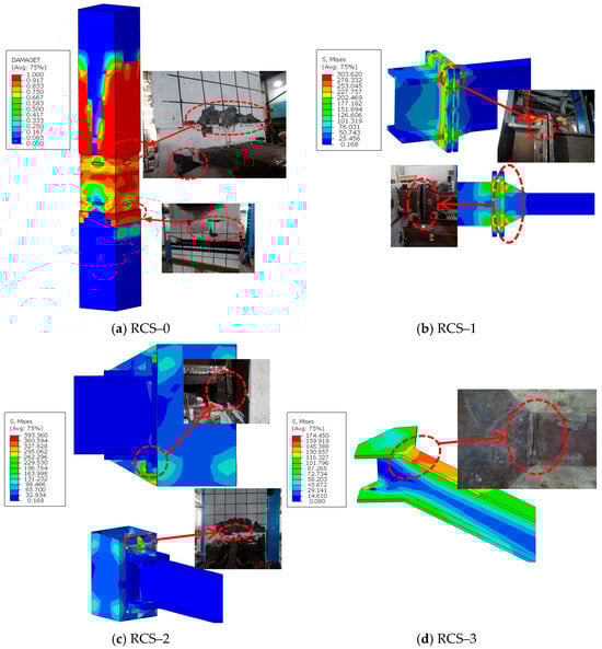 During the loading process of the experiment, the four joints exhibited various failure modes. The specimen RCS-0 underwent failure during the second cycle as the loading displacement at the top of the column reached 30 mm. The concrete at the upper and lower joints of the steel plate hoops and the column was crushed, and cracks emerged in the welding seam between the steel beam and the steel plate hoop, signifying a substantial reduction in the lateral bearing capacity of the joint, meaning it is deemed a failure. When the loading displacement at the top of the column reached 50 mm on the second cycle, the external hanging short beam welding seam area of the specimen RCS-1 cracked, and noticeable out-of-plane flexural deformation occurred on the two end boards. As the displacement was further loaded to 80 mm, the welding seam cracks continued to widen, and the horizontal bearing capacity of the joint was less than 85% of the peak load, indicating that the specimen had failed and reached destruction. The steel beam and column of the specimen RCS-2 were fixed using a slot. During testing, audible friction was detected between the end board and slot. The slot connection was responsible for transmitting both bending moment and shear force. Beyond a loading displacement of 40 mm, cracks emerged in the welding seam that joined the slot and cover board. Continuing to load up to 50 mm in the second cycle resulted in the crushing and serious spalling of the upper concrete of the steel plate hoop. Additionally, the welding seam between the slot and the cover board was fractured, which points towards joint failure and destruction. The beam–column connection of the specimen RCS-3 was established by means of an outer ring beam and lateral bolts, accompanied by a wedge plate at the end board to bear a portion of the shear force. When the interlayer displacement reached 50 mm during loading, the joint achieved its highest bearing capacity. As loading continued and reached 60 mm during the second cycle, a fracture became apparent in the welding seam of the left beam flange mutation, leading to the cessation of the loading process and indicating that the specimen had failed.