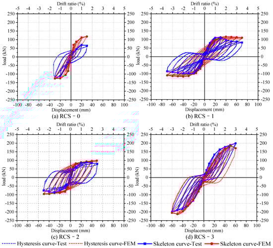 The hysteresis curve and skeleton curve, as obtained via finite element analysis, are presented in Figure 7. The numerical simulation can reasonably predict the overall trend of the hysteresis curves of the four joints in comparison to the experimental findings. However, RCS-1 did not exhibit significant necking effects in the final numerical results. The hysteresis loop envelopes for RCS-2 and RCS-3 are in good agreement, whereas the hysteresis loop envelopes obtained via numerical simulation for RCS-0 and RCS-1 are marginally smaller when compared to the experimental results.
