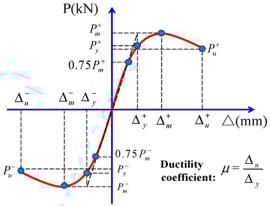 As illustrated in Figure 8, the yield point and yield displacement can be determined from the ultimate bearing capacity of the skeleton curve. Table 3 presents the yield load, yield displacement, ultimate load, ultimate displacement, and ductility coefficient for specimens with four joints. From these data, Figure 8 is plotted. The ductility coefficient is defined as the ratio of the beam end displacement at joint failure to the beam end displacement. This can be computed using the formula below: