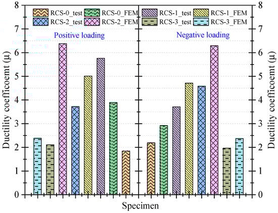 From Table 3 to Figure 9, it can be observed that the ductility of the specimens RCS-0 and RCS-3 specimens is poor, as indicated by the finite element results which reveal positive and negative direction ductility coefficients of 2.92 and 3.89 and 2.37 and 2.38, respectively. In contrast, the specimens RCS-1 and RCS-2 exhibited better ductility or deformation capacity, with positive and negative direction ductility coefficients of 4.71 and 5.01 and 6.29 and 6.38, respectively. The ductility coefficients obtained from the finite element analysis exceed the experimental values. The experiment applied negative loading, leading to a build-up of concrete damage in the positive direction. As a result, the positive direction demonstrates a higher level of yield point displacement and lower ductility coefficients than the negative direction.