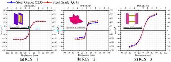Given the structural variances in the beam–column connections between the three separate RCS joints, this section selects specific connecting components for each joint. One of the analysis parameters is the modification of their steel strength. Figure 11 exhibits the detailed connection components. The validated finite element model permits a comparison of the skeleton curve of the beam–column joint under a reciprocating load. Keeping the dimensions of the specimens and all other conditions unchanged, only the steel grades of the key connecting components in the three demountable joints have been altered from the original Q235 steel to Q345 steel. The finite element analysis obtains the column load–displacement skeleton curves of the three demountable joints under different strength steel connection conditions, as shown in Figure 11.