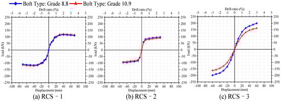To examine the effect of bolt strength on the seismic behavior of RCS joints, we upgraded the high-strength bolts of the numerical models of the three demountable beam–column joints from grade 8.8 to 10.9. Additionally, the bolts’ pre-tightening force in the finite element model was raised from 120 kN to 150 kN. The skeleton curves for each RCS joint with different bolt types are illustrated in Figure 12. It is evident from the diagram that the bolt type does not have a noteworthy impact on the load-carrying capacity of specimens RCS-1 and RCS-2. In contrast, the demountable RCS-3 joint specimen features a concrete column with a crossbeam that is connected to a steel beam using diagonal bolts. The diagonal bolts are responsible for the primary shear force and bending moment support. As such, improving the strength of the bolts could in turn improve the joint’s ability to withstand horizontal loads.