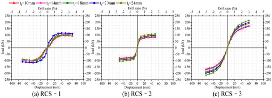 Figure 13 demonstrates the vital impact of flange thickness on the mechanical behavior of the joint. For studying the effect of the flange thickness of pure steel beam segments on the seismic conduct of demountable RCS joints, five finite element models with varying flange thicknesses (tf = 10 mm, 14 mm, 18 mm, 20 mm, 24 mm) were developed. From the skeleton curves acquired via finite element analysis, it is evident that the maximum bearing capacities of the specimens RCS-2 and RCS-3 improves as the flange thickness increases. The bearing capacity increases by 10.02% and 8.24%, respectively, when the flange thickness increases from 10 mm to 24 mm. Concerning the RCS-1 specimen’s skeleton curve, the joint’s bearing capacity exhibits a continually increasing trend with an increase in the flange thickness. However, when the flange thickness continues to increase to 24 mm, the joint’s maximum bearing capacity diminishes. These results indicate that the steel beam design of the specimen RCS-1 is the most suitable, enabling the maximum bearing capacity of the joint.
