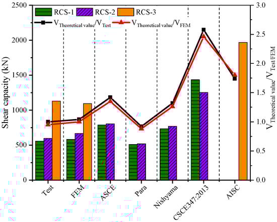 Figure 14 and Table 4 show the theoretical shear strength calculation values obtained by four different shear strength methods for three demountable RCS joint specimens. The results show that, compared with the experimental results, except for the Para method which calculates a shear strength lower than the experimental result, the remaining formulae calculate shear strengths higher than the experimental results. This is because the RCS-1 and RCS-2 specimens did not reach yield throughout the loading process of the experiment, resulting in a relatively small contribution to the shear strength. The theoretical calculation formula uses the yield strength of the steel; therefore, the theoretical calculation value is greater than the experimental result. From the data in the table, the finite element analysis of RCS-1 and RCS-2 joint core regions has greater shear strength than the experimental results, while the finite element calculation result of RCS-3 is smaller than the experimental value. Therefore, the ratio of the theoretical calculation result to the finite element result is smaller than the ratio of the theoretical calculation result to the experimental result. Because the Para method does not consider the shear strength of the columnar steel plate, the calculated shear strengths of the specimens RCS-1 and RCS-2 are 8% and 13% less than the experimental results and 12% and 22% less than the FEM predicted values, respectively. The ASCE guide method calculates results that are 42% and 30% higher than the experimental values, which are 35% and 21% higher than the FEM predicted values. The Nishiyama method gives results that are 32% and 29% higher than the experimental values, which are 26% and 15% higher than the FEM predicted values. The calculated value using the national standard CSCE 347:2013 is 158% and 110% higher than the experimental values, which are 146% and 88% higher than the FEM predicted values. This is because the formula recommended in the CSCE standard for calculating the shear strength of the core region of the columnar through the type joint also considers the influence of the end plate bolt connection, resulting in a greatly overestimated shear capacity of the joint. For the specimens RCS-3, the calculated result using the AISC standard is 74% higher than the experimental value and 80% higher than the FEM predicted value. This is because the formula considers the influence of the welding of four corner plates on the side of the steel plate hoop, which improves the calculated value of the shear capacity of the joint core region.