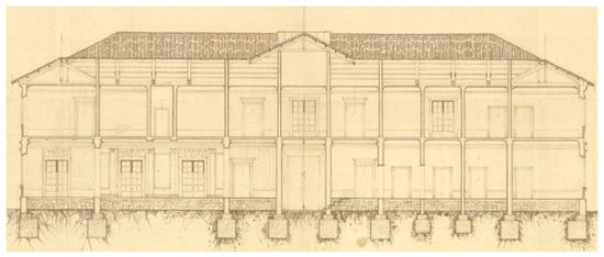 The Torlonia Building, which the herein reported analysis will refer to, dates back to the 1920s and was constructed according to the provisions of the Italian Royal Decree 573, issued on 29 April 1915, just after the Avezzano earthquake. Consequently, it shows some early anti-seismic design features. Particularly, according to the regulations at the time, concerning the number of floors and heights, the building was developed on two levels above the ground (two storeys), with an unusable garret. In Figure 1, a longitudinal vertical section of the building’s original conceptual design is reported. Even if it is not evident in the figure, a gap is present between the foundation and the planking level, which is therefore a slab, with two practicable spaces at basement level. The building is of a C shape (Figure 2), which makes it intrinsically vulnerable.