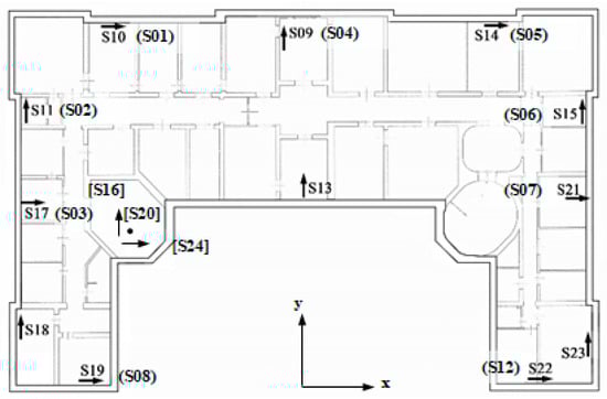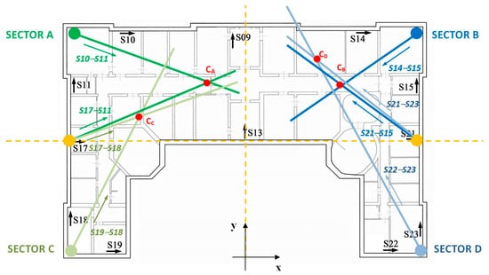 If the floor were perfectly rigid, all lines would intersect at a unique point, which would be the floor’s exact centre of rotation. This is not the case, and, even if we excluded the two wings, a unique centre of rotation for the main body would not be evident. However, important information on the behaviour of the building may be inferred. For ease of reading, the plan was divided into four sectors: sectors A and B include the left side and right side of main body, respectively, whereas sectors C and D are the left wing and the right wing, respectively. What is immediately noticeable is that the direction of the centre of rotation for S17–S11 is almost coincident with the direction of S17–S18; and the direction of S21–S15 is almost coincident with the direction of S21–S23. This circumstance can be considered representative of the fact that, near the two secondary façades, the floor is quite rigid. However, keeping into account all the directions we deduced, four different centres of rotation were obtained (one for each sector: CA, CB, CC and CD in Figure 10). It is interesting to observe that CA and CB are aligned along x at about half the height of the main body, whereas the positions of CC and CD confirm that the two wings do not have symmetrical behaviour. Moreover, the distances of these two centres from the corresponding wings are compatible with the greater displacements recorded on the right corner (see Figure 6) with respect to the left one.