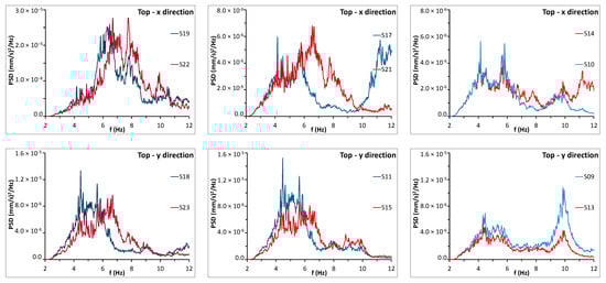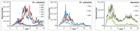 In Figure 5, the PSDs of all the recordings at the first floor and those at the basement are plotted. As can be seen, the same resonance frequencies highlighted in the recordings of the second floor are also present for the first floor, with low energy. The spectra of the recordings at the basement also contain other lower frequency components.