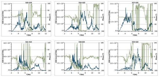 Cross-spectral densities at the second floor (phase factor in green lines).