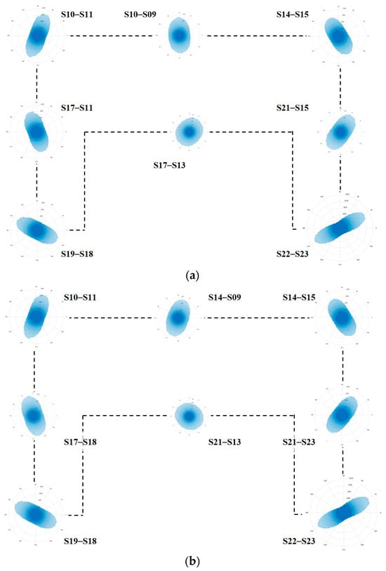 A more detailed representation of motion direction at each measurement point can be obtained through angle distributions, which report the number of times a particle motion is oriented in a certain direction with an approximation of a one-degree angle (Figure 7a,b). The tangles we obtained have quite a regular shape, approximating an ellipse. Then, from each angle distribution, the prevailing direction of motion can be made to coincide with the major axis of this ellipse, whereas the minor one can be assumed as a measure of the dispersion. In other words, the more the approximation ellipse will be elongated and narrowed, the more the movement of the point will keep a constant inclination over time. In contrast, the more the approximation ellipse will be rounded, the more the movement of the point will change direction over time. From the figures, it can be seen that corners have a behaviour closer to the first category, whereas intermediate points fall into the second one, exhibiting a more significant dispersion of the direction of motion. Moreover, the tangles at intermediate points S09 and S13 differ depending on whether they are coupled with the sensor to their right or with the one to their left.