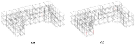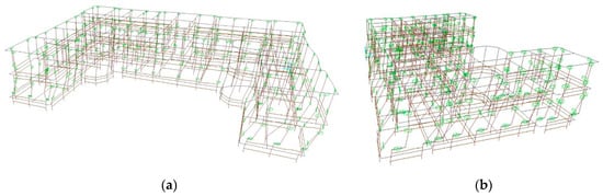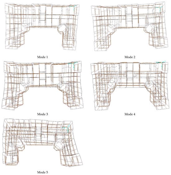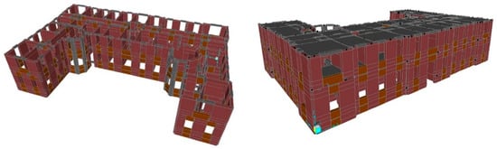 A finite element model of the structure (Figure 11) was set up by resorting to the equivalent frame method []. The above results of experimental analysis provided relevant information and support in realizing a model, which was reliable and close to reality. For its calibration, not only the mechanical parameters, determined on the basis of traditional tests, but also the findings of experimental vibration analysis were used. The latter highlighted, in particular, the need to take into account the floors’ deformability. Assuming that the floor diaphragms were planar rigid bodies, as is usually the case, it would have been an oversimplification in this case.