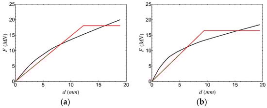 Force–displacement curves and corresponding bi-linearized curves (red lines) relative to a force distribution proportional to (a) the first mode and (b) the fourth mode.