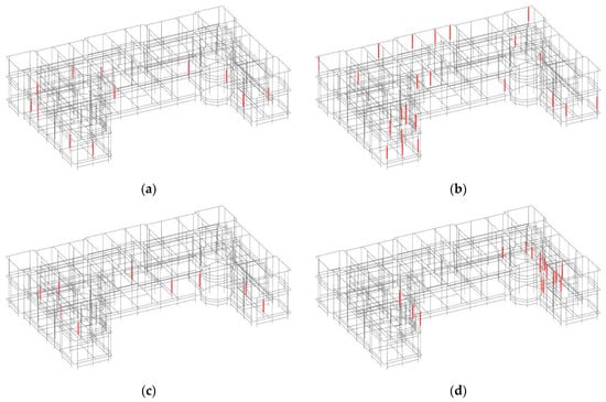 Elements (in red) exceeding seismic demand at SLV (TR = 475 years) for linear analysis: (a) shear for prevalent seismic action along x; (b) axial and flexural forces for prevalent seismic action along x; (c) shear for prevalent seismic action along y; (d) axial and flexural forces for prevalent seismic action along y.