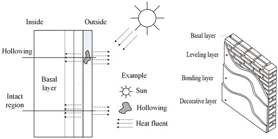 The basic heat transfer process of a building facade is shown in Figure 1, in which the structure of the building facade consists of a basal layer, a leveling layer, a bonding layer, and a decorative layer (without decorative brick) from inside to outside [5] and the amount of heat flow is represented by the number of dashed arrows.