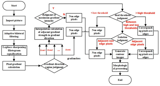 The traditional Canny segmentation algorithm is improved based on the features of the polarization thermal image of the hollowing defects and the shortcomings of the traditional algorithm as shown in Table 1. Figure 2 shows the process of extracting the edge contours from the polarization thermal image of the hollowing defects on the building facade in this paper, which contains the import of images, image preprocessing (such as adaptive bilateral filtering, Laplace sharpening, and histogram equalization), the calculation of the gradient magnitude and direction of each pixel, the determination of whether a pixel is an edge point using non-maximum suppression roughly, the acquisition of true edge points determined using the dual-threshold segmentation and isolation judgement, and the connection of unclosed edges using the morphological processing method to obtain complete edges.