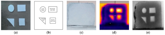 The experimental wall is mainly made of concrete of a gray color (Figure 4c), with a size of 500 mm (L) × 500 mm (W) × 70 mm (H). According to the literature [41], the thermodynamic property of the air layer in the hollowing defect is far closer to that of a polystyrene foam plate, and the principle of using polarization thermal imaging for detecting hollowing defects is based on the differences in thermodynamic parameters (mainly thermal conductivity) between the defect and defect-free area. So, a polystyrene foam plate can be used to simulate the air layer in the hollowing defect in the reality of the experiments. The hollowing is artificially prefabricated on the experimental facade by fixing four polystyrene foam plates with low thermal conductivity and different sizes, which simulate the various forms of real hollowing defects on building facades. The size and position distribution diagram of the preset hollowing defects is shown in Figure 4. The literature [5] shows that the actual hollowing situation of the depth from the surface of the experimental wall to the exterior face of the foam board is over 5 mm, so the thickness of the hollowing, which is prefabricated on the experimental wall, is 10 mm. Based on the structural composition of actual building facades and the construction parameters of experimental walls referenced in relevant papers [41,42,43], the experimental wall is composed of a substrate (50 mm), a leveling layer (10 mm), a bonding layer (cavity layer) (5 mm), and a decorative layer (without decorative brick, 5 mm) from inside to outside. The cement mortar ratio of the leveling layer is 1:2, the cement mortar ratio of the bonding layer is 1:3, and their thermodynamic parameters are close to those of the corresponding structures of actual building facades.
