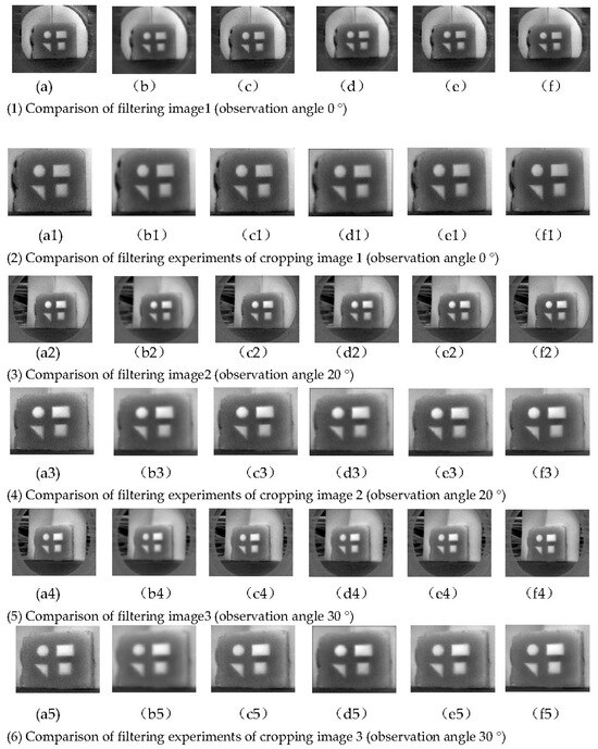 In order to verify the effectiveness of the adaptive bilateral filtering algorithm, the polarization thermal images of the building facade hollowing defects obtained from the experimental platform were filtered using different methods. To effectively avoid the interference of redundance, such as the background and border in polarization thermal images, a comparative experiment is conducted regarding the filtering effect of the complete images and the images after removing redundant interference. To avoid accidental errors, three sets of polarization thermal images of hollowing defects are selected as experimental objects with optimum distance and observation angles of 0°, 20°, and 40°, respectively. The test image results are shown in Figure 7.