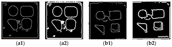 Figure 10. The results of hollowing defect images processed using the traditional Canny algorithm and morphological methods: (a1) Output edge of cropped infrared image; (a2) The result of (a1) after application of morphological methods; (b1) Output edge of cropped polarization image; (b2) The result of (b1) after application of morphological methods.