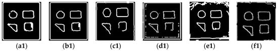Figure 12. Morphological processing results: (a1–f1) Roberts, Sobel, Prewitt, Log, Canny, and improved Canny algorithm.