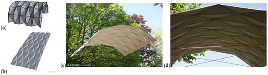 (a,b) Waterbomb folding structure: different choices of folding angles of the base cell lead to different curvature of the whole waterbomb structure; (c,d) Photograph of a carbon-reinforced concrete roof prototype folded using origami tessellation kinematics (Photographs: Rostislav Chudoba).