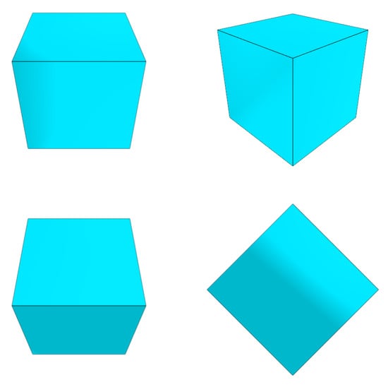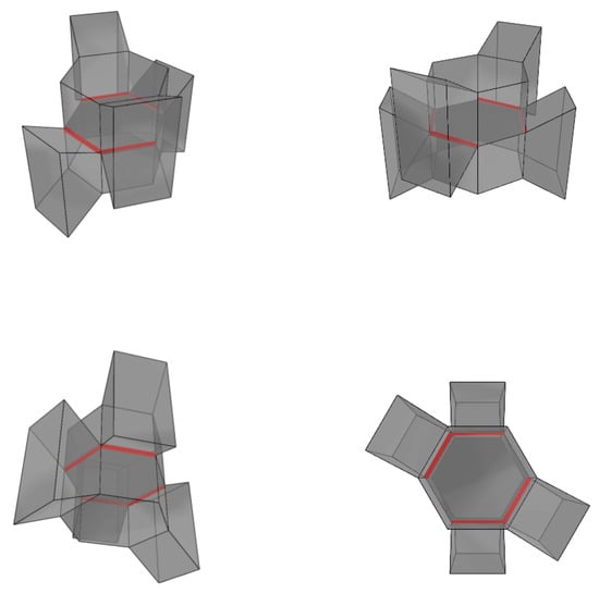 A mathematically precise definition of a topological interlocking assembly can be found in ref. [], where the authors introduce the notion of a family of continuous motions to establish the interlocking property. Further examples of topological interlocking assemblies can be found in ref. [], where the authors exploit the idea of deforming tiles of a tessellated three-dimensional structure to construct topological interlocking blocks. Thus, the resulting assembly realizes the surface of the underlying structure. The corresponding topological interlocking that is based on the surface of a cube is illustrated in Figure 7. Here, any two blocks of the assembly can form the frame of the given assembly.
