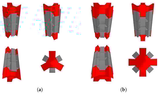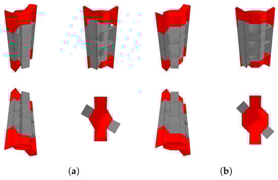 The 2-periodic interlocking assemblies of the generalized (a) 6-candy and (b) 8-candy of Figure 15. The frames are shown in red.