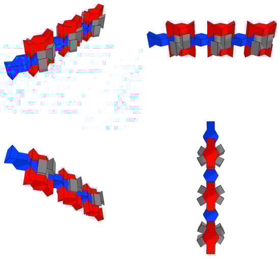 The second assembly is achieved in a similar manner by stacking the blocks along the central n-gons. In this application, however, the assembly is constructed by a 3-periodic pattern. The second blocks in this pattern are obtained from the first one by introducing a 60-degree or 45-degree rotation about and the third ones by rotating by or degrees (see Figure 12). The same reasoning as above shows that this yields a topological interlocking assembly.