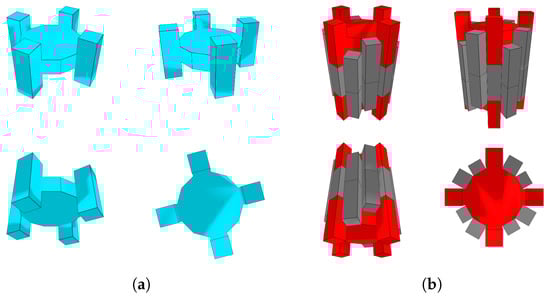 For and , the resulting n-cube-candies and a corresponding topological interlocking assembly analogous to the construction in Application 2 can be seen in Figure 17 and Figure 18.