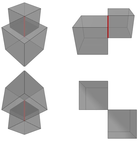 Note that the convexity of the blocks is not required to formulate the above linear program. All that is needed is to be able to define an interior and an exterior of a given block, which is the case for the blocks described in this section. For the assemblies of the n-cube-candies illustrated in Figure 18 and Figure 19, the formulation of the linear program described above already verifies the interlocking property of the given assemblies. On the other hand, for any of the assemblies of the n-candy presented in Section 3.2.1, the constraints considered by the linear program are not sufficient to prove the interlocking property as it finds non-zero solutions; since there are no edge–edge contacts of non-parallel edges, the constraints of the corresponding linear program only consist of the point–plane constraints arising from the two-dimensional intersection of facets of different blocks, i.e., the modelled contacts are solely the contacts of the n-prisms and thus the modelled assembly is equivalent to a pillar of stacked n-prisms. Intuitively, these contacts are not sufficient to establish the interlocking property in that case. The above test is therefore generalized by also modelling one-dimensional contacts between faces of different blocks, which will be called contact edges. There are three types of contact edges that can arise from an intersection of a block a with a block b: