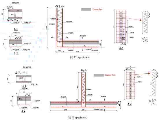 Four full-scale top joints (two precast joints and two corresponding CIP joints) of a prototype multi-cabin precast utility tunnel (Figure 1) were designed and constructed at a site with a sediment thickness of 10.2 m in a moderately seismic region in China. The design of these joints was carried out in accordance with the provisions outlined in Chinese codes: GB 50011-2010 [] and GB/T 50838-2015 [] and then checked by ACI 318-19 []. The joints were labeled as PE (exterior joint of hybrid precast utility tunnel), PI (interior joint of hybrid precast utility tunnel), RE (exterior joint of CIP structure), and RI (interior joint of CIP structure) for reference. The structural characteristics, detailed dimensions, and reinforcement details of the specimens are illustrated in Figure 1 and Figure 2 and the specific characteristics of the precast specimens are listed as follows: