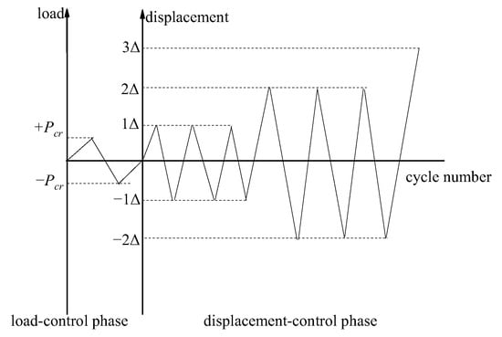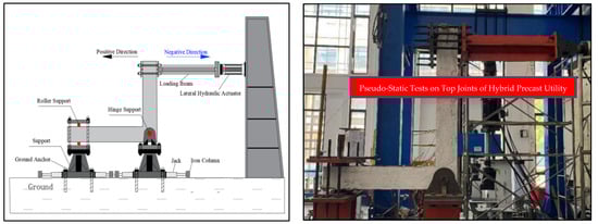 To simulate the racking deformation of the utility tunnel caused by soil–structure interaction during the earthquake, the reversed cyclic loading was used for four specimens [,]. The diagram of the low-cyclic loading test is illustrated in Figure 4 with the loading point situated at the top of the sidewall.