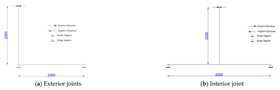 The boundary conditions of the test specimen (shown in Figure 5) were established based on Wang’s proposed seismic analysis model for rectangular tunnels []. In this configuration, the connection zone was supported by a hinge, while the right side of the specimen was a horizontal roller. Considering the very small axial compression ratio of only 0.05 in the prototype of this study, the tests eliminated the vertical loads.