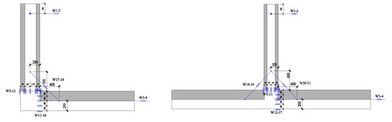 Electrical resistive strain gauges were installed on the reinforcement of both the slab and sidewall to measure the strains of longitudinal rebars []. The chosen gauge featured a constantan 350 Ω grid covered with polyimide encapsulation for protection. Artificial markers were used to indicate crack propagation, and a specialized apparatus was employed to measure and record the corresponding crack width during observation.