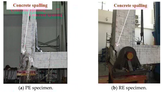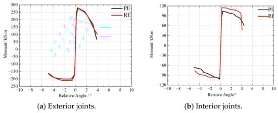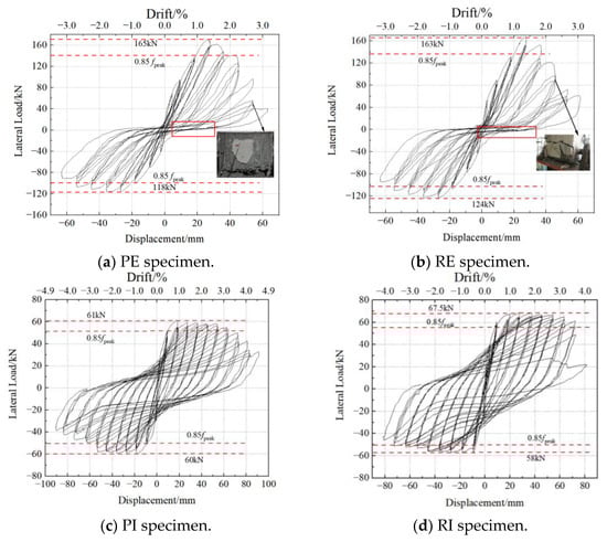 In the case of the exterior joints, the number and shape of hysteresis loops for PE and RE were similar, indicating similar hysteresis characteristics. Prior to specimen failure (load-carrying capacity greater than 0.85 fpeak), the hysteresis curves exhibited a relatively full shape. However, after failure occurred, over the course of loading, the hysteresis loop transitioned from a spindle shape to an anti-S shape, leading to a gradual reduction in energy dissipation capacity. This transformation can be primarily attributed to joint concrete spalling. After the bearing capacity dropped to 85%, the specimens exhibited significant sliding behavior, as observed in the highlighted region in Figure 10a,b. This was primarily due to extensive concrete spalling on the outer side of the sidewalls, as shown in the images in Figure 10a,b, which resulted from the insufficient anchorage length of the reinforcement.
