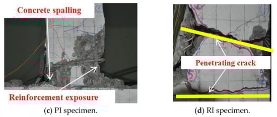 - The crack propagation pattern of both PI and RI specimens was the same. In the PI specimen, the initial crack emerged (Figure 8c) at the base of the sidewall when subjected to lateral loads of +30 kN and −25 kN, while in the RI specimen, cracks were observed (Figure 8(d)) at the bottom of the sidewall under lateral loads of +35 kN and −24 kN. PI and RI were yielded after lateral loads up to +64.38 kN (+0.65%), −49.50 kN (−0.55%) and +63.30 kN (+0.69%), −57.10 kN (−0.51%), respectively. Moreover, a growing number of cracks related to flexural action PI and RI were observed as loading progressed. The peak loads for both PI and RI specimens were reached at +71.70 kN (+1.02%) and +72.90 kN (+1.14%) in the positive direction. In the negative direction, the corresponding peak loads were 49.50 kN (−1.05%) and −57.20 kN (−1.10%). During this phase, concrete peeling occurred at the sidewall, and the longitudinal reinforcement yielded in both PI and RI specimens. Following the peak loads, the load-carrying capacity of the specimens decreased, resulting in final story drifts of +3.89% and −3.30% for PI, and +2.10% and −2.23% for RI.