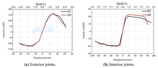 The initial stiffness of RT and PT exhibited similarities. The maximum load-carrying capacities for PT and RT in the positive direction were 165.00 kN and 163.20 kN, respectively, while in the negative direction, they were −118.00 kN and −124.00 kN. Comparatively, PT displayed a 1.1% increase in positive load-carrying capacity and a −5.1% decrease in negative load-carrying capacity when compared to RT. This difference can be attributed to the exterior joints’ asymmetric reinforcement design scheme, which favors a higher positive-load-bearing capacity over the negative counterpart.