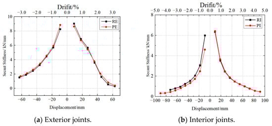 The stiffness of both exterior joints and interior joints decreased as the displacement increased, this was primarily due to the cumulative damage in the sidewalls and slabs resulting from the reversed cyclic loading. Figure 12 shows that the curves of stiffness degradation for the hybrid precast utility tunnel joints overlap with those of the CIP joints at similar displacement levels, indicating a similar pattern of stiffness degradation. Throughout the entire test, noticeable stiffness degradation was observed for both types of joints, particularly prior to yielding. This can be attributed to the generation and development of cracks during this stage, with few new cracks being observed after yielding.