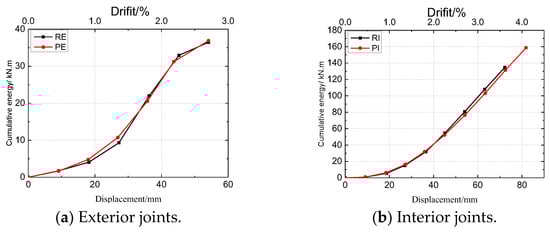 Furthermore, it can be observed from Figure 13 that the energy dissipation capacity of interior joints is superior to that of exterior joints. This advantage is likely due to the quicker formation of plastic hinges during the loading process. At the start of the testing, with relatively minor displacements at the top of the sidewalls, the specimens were in the elastic stage, resulting in a comparably lower cumulative energy dissipation. As the lateral displacement increased, the specimens gradually entered the elastic–plastic stage, and the energy dissipation increased accordingly. However, after reaching the failure stage, the trend of increasing energy dissipation diminished. This indicates that the specimens were severely damaged at this point, and they could no longer dissipate energy through plastic deformation or damage of the material.
