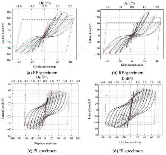 The hysteresis curve, depicting the correlation between lateral load and displacement of the specimen under reversed cyclic loading, plays a crucial role in evaluating the seismic performance of structures. Additionally, it serves as the foundation for determining the restoring force model and conducting nonlinear seismic response analysis. Therefore, the hysteresis curves recorded for the four specimens are collected and plotted in Figure 10.