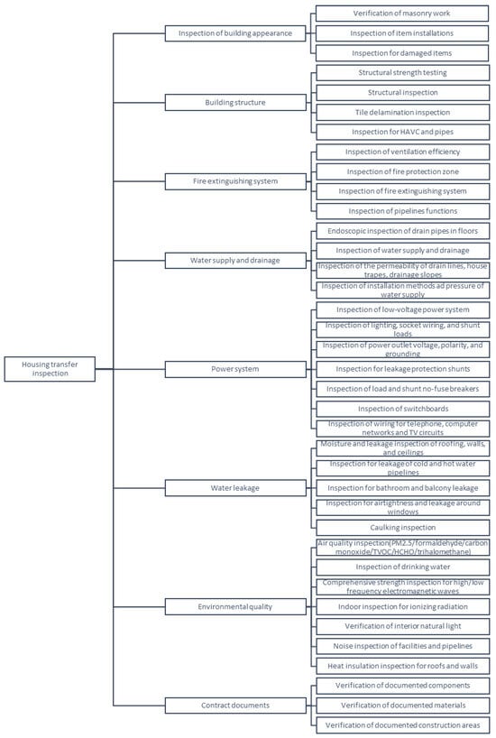 The dynamics of the housing market were relatively straightforward, with potential homebuyers primarily seeking stable and uncomplicated living spaces. However, evolving lifestyles and increased affluence have ushered in a shift towards a preference for more comfortable, luxurious, and livable homes. Modern consumers now prioritize well-designed spaces, modern amenities, and convenient living environments, which have become fundamental considerations for those in the housing market []. Furthermore, recent advancements in the information and communication sectors, coupled with a growing emphasis on smart cities and contemporary lifestyles, have further reshaped buyer preferences. This evolution has transcended the mere structural aspects of buildings, spurring a demand for properties with multifunctional capabilities. The final inspection and handover of properties play a profoundly significant role in the housing market transaction process, whether dealing with new constructions or existing properties. This critical step is essential for all transactions []. However, it is worth noting that there are currently no established standard or systematic criteria for property handover, and policy direction remains uncertain. Presently, housing safety inspection and assessment policies are placing increased emphasis on raising public awareness of residential safety, leading to more thorough examinations of housing safety aspects [,,,].