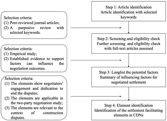 As discussed, the overarching aim of this study is to unearth negotiators’ settlement facilitating elements. To achieve this, a structured literature review was applied as it is a commonly recommended method to identify influencing factors in organizational research []. The development of the settlement facilitating elements is presented in Figure 1.
