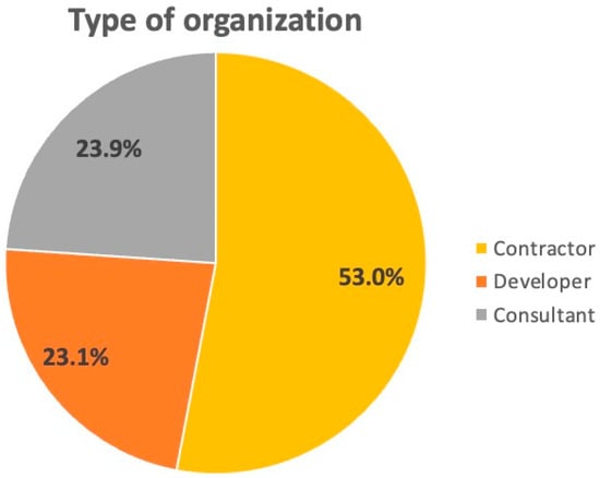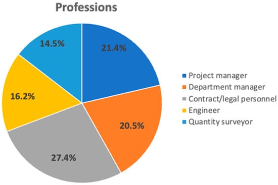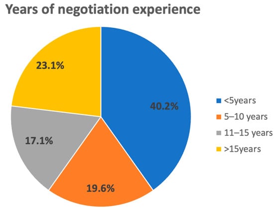 The survey was distributed via email invitation in September 2021. The target respondents were from the Hong Kong Institution of Engineers, Hong Kong International Arbitration Centre, and Hong Kong government works departments. To ensure the quality of the data, a filter question, “Have you ever been involved in construction dispute negotiations”, was used at the start of the survey. If the answer was “no”, the survey would be ended. Furthermore, the data screening was applied to exclude questionnaires with missing data or any outliers []. Finally, 117 valid responses were achieved. The profile of the respondents is displayed in Figure 2, Figure 3 and Figure 4. Around 60% of the respondents have more than 5 years of working experience in CDNs, suggesting the reliability of the data.