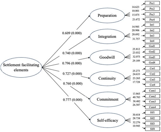 SEM measurement models mainly contain two types of variables: latent variables and observable variables. In this study, the six settlement facilitating elements are the latent variables that are predicted by corresponding observable variables (i.e., measurement items). Each latent variable is measured by four items.