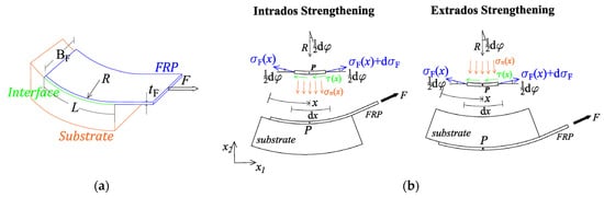 The effectiveness of a reinforced system significantly depends on the bond behavior, given that the weakest point typically resides at the interface between the reinforcement and the substrate. Typically, shear tests are employed to assess this property [6,7,8,9]. When dealing with curved substrates, experimental observations have highlighted that the influence of substrate curvature, along with the positioning of the reinforcement, is substantial [10,11,12,13]. In the specific experimental study presented in [10], it was observed that the extrados strengthening configuration increased the load-bearing capacity, while intrados exhibited a reduced capacity compared to flat substrates, and higher-curvature substrates showed more pronounced deviations from flat cases. The geometric characteristics introduce more complex bonding mechanisms, such as the appearance of normal stress and peeling effects.