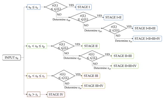 The solutions for the initial stage can be analytically obtained with these boundary conditions, as detailed in the following sub-sections. Subsequently, we can determine the displacement value and its first derivative at the junction point between the next stage (, , or ), which will then serve as the boundary conditions for the next stage. The junction point can be determined by comparing whether exceeds the corresponding stage limitation (, , or ) or not, while considering the influence of the normal stress at each under calculation. This calculation approach, implemented through MATLAB, is summarized in Figure 3.