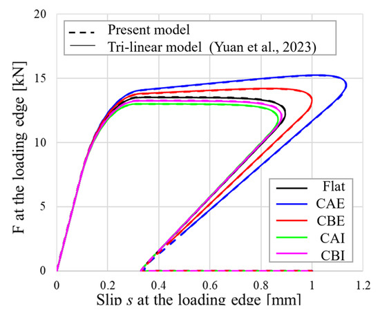 The load-slip curves obtained using the current and existing approaches are compared in Figure 6b–f. The modeling outcomes show a good agreement, the two analytical models exhibit only slight disparities, and both display snap-back behavior, which is not present in the numerical modeling results. This difference can be attributed to the distinct loading process simulation approaches: in the analytical models, increasing slips were imposed at the free edge, whereas, in the numerical model, slip increments were applied at the loading edge, naturally precluding any reduction in the slip.