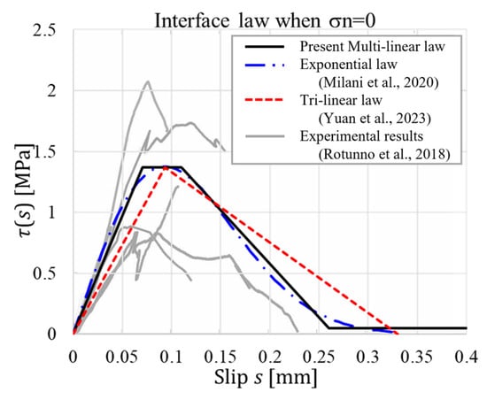 In a previous study based on trilinear laws [16], an extensive investigation of the impacts of the parameters embedded in the interface law was conducted. It was ascertained that the bond strength of the reinforced system mostly depended on the fracture energy of the interface, regardless of the precise configuration of the interface law, as corroborated by the findings thus far [16,17,24]. Further conclusions have been drawn, highlighting that the interface friction angle and residual friction angle exerted minimal influence on the global curves, owing to the considerably low magnitude of the interface normal stress. Therefore, within this section, our focus will center on investigating the contrasts between the current multi-linear model and the previous trilinear-law-based model, while also examining the effects of residual strength. This analysis will be undertaken while maintaining consistent values for the friction angles.