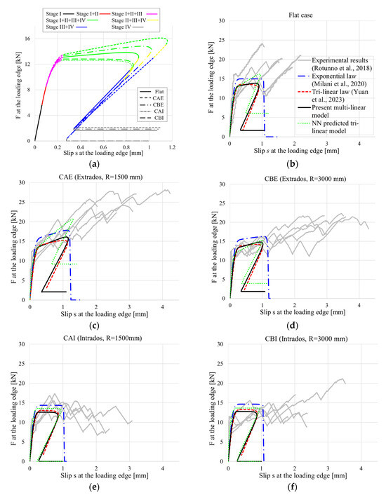 (a) The global load-slip curves obtained with the present model; and comparisons with the previous studies (the exponential model [19], the tri-linear model [16] and the experimental data [10]) for groups: (b) flat, (c) CAE, (d) CBE, (e) CAI, and (f) CBI.