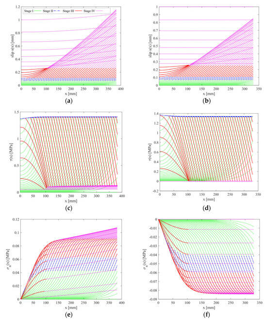 The ODE presented in the previous section can be solved analytically with appropriate boundary conditions for each stage. However, as the loading progresses, different shear stress stages appear along the interface, and we define , , and as representing the junction points between the elastic and plateau stages, plateau and softening stages, and softening and residual strength stages, respectively.