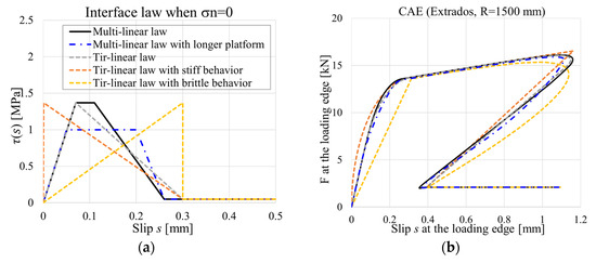 Thanks to the adaptability and robustness provided by the analytical approach, this section aims to assess various commonly employed forms of interface laws, as illustrated in Figure 8a. The comparisons encompass classic trilinear laws, trilinear laws exhibiting either rigid or brittle behavior, and quadra-linear laws with differing plateau stage durations. It should be noted that all these relationships share closely aligned fracture energy values. The global load-slip curves for case CAE are presented in Figure 8b. The differences corresponding to the elastic stiffness and beginning of the residual stage can be identified, nonetheless, due to the near-identical fracture energy values, and the results demonstrate an overall convergence.